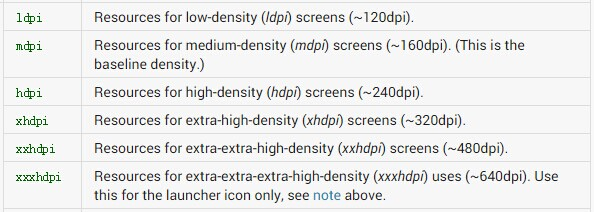 - ldpi:120dpi,像素密度与dp转换关系为:1dp = 0.75px