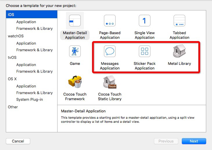 很明显多了两个模版是为了iMessage开发和自定义表情包,这两部分的开发初探教程已经发布。有关iMessage及最新Xcode改版的相关功能的课程视频下载链接如下:http://pan.baidu.com/s/1hslUnfm 密码:bsha