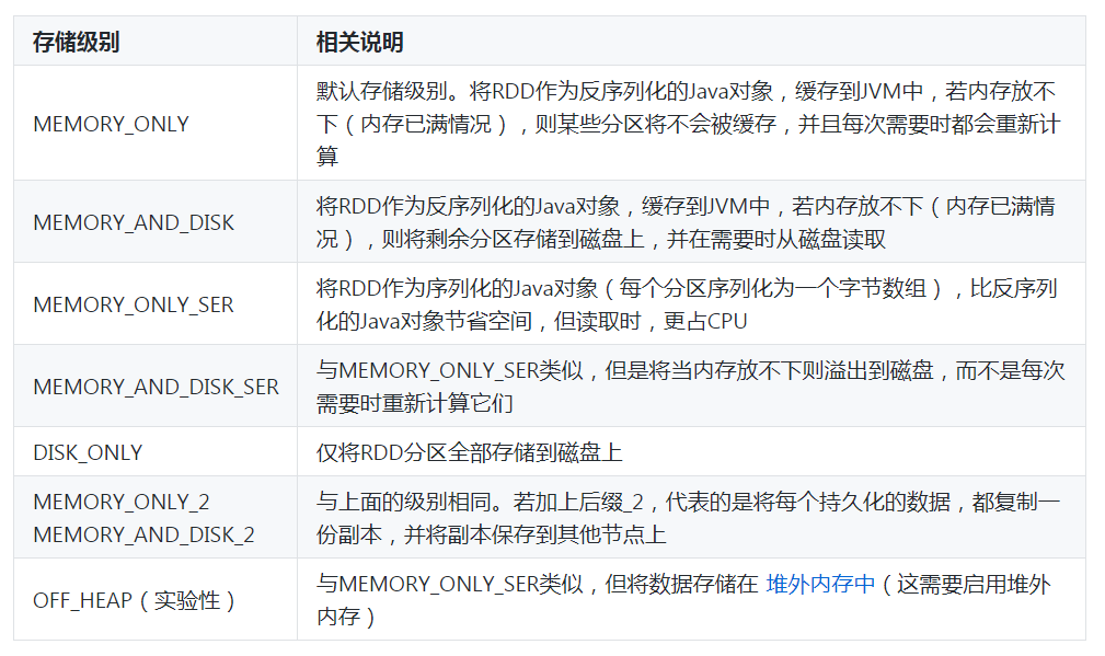 在表1中,列举了持久化RDD的存储级别,我们可以在RDD进行第一次算子操作时,根据自己的需求选择对应的存储级别。