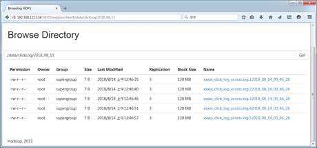 从图2可以看出,首先将日志存放目录log中的日志文件移动到待上传toupload目录下,并根据业务需求重命名,然后脚本自动执行“hadoop put”上传命令,将待上传目录下的所有日志文件上传至HDFS中。通过HDFS Web界面可以看到,需要采集的日志文件已经按照日期分类,上传到HDFS中,如图3所示。