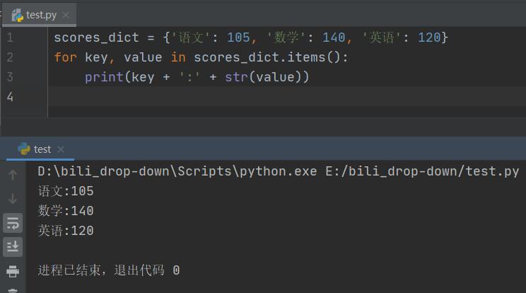 print(key + ":" + str(scores_dict[key]))    # 返回字符串