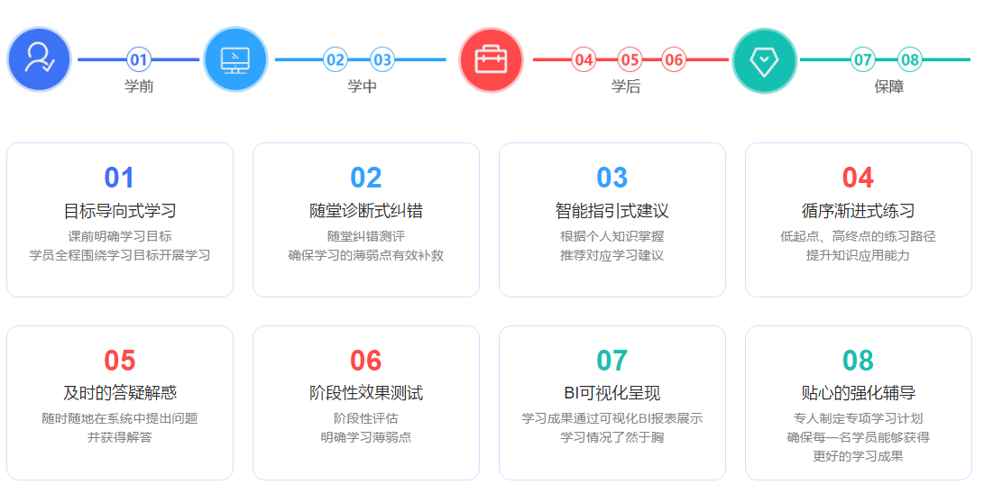系统归纳出学前、学中、学后、保障、就业等几大重点模块,并在模块中制定教学目标、能力分析、测试纠错、在线题库、面试讲解等,合理规划各阶段学生需要掌握的能力核心。